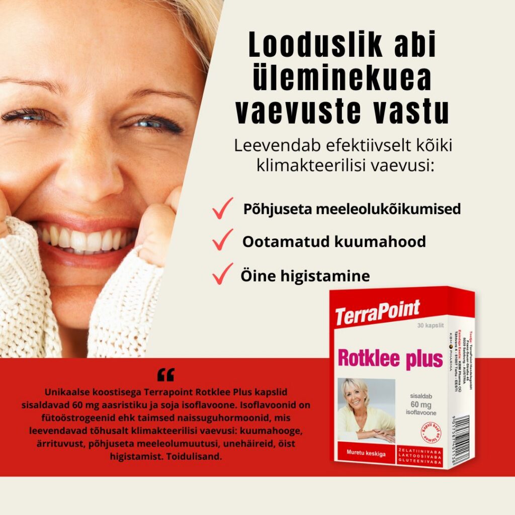 Üleminekuea vaevusi saab vähendada arsti poolt määratud hormoonasendusraviga. Paraku tekitab hormoonravi üsna sageli tõsiseid kõrvaltoimeid ning ei sobi kaugeltki mitte kõigile naistele. Õnneks on olemas efektiivne ja ohutu alternatiiv – taimsed naissuguhormoonid ehk fütoöstrogeenid, mida sisaldavad aasristiku ja soja ekstraktid. Heaks valikuks on looduslik preparaat Terrapoint Rotklee Plus, mis sisaldab suurel hulgal sojaoa ja aasristiku isoflavoone ning on apteekides saadaval ilma retseptita. Isoflavoonid ongi need eespool mainitud fütoöstrogeenid, mis leevendavad tõhusalt üleminekuea vaevusi: kuumahooge, öist higistamist, ärrituvust ning põhjuseta meeleolukõikumisi. Isoflavoonid tugevdavad ka luustikku, soodustades kaltsiumi ladestumist luudesse.